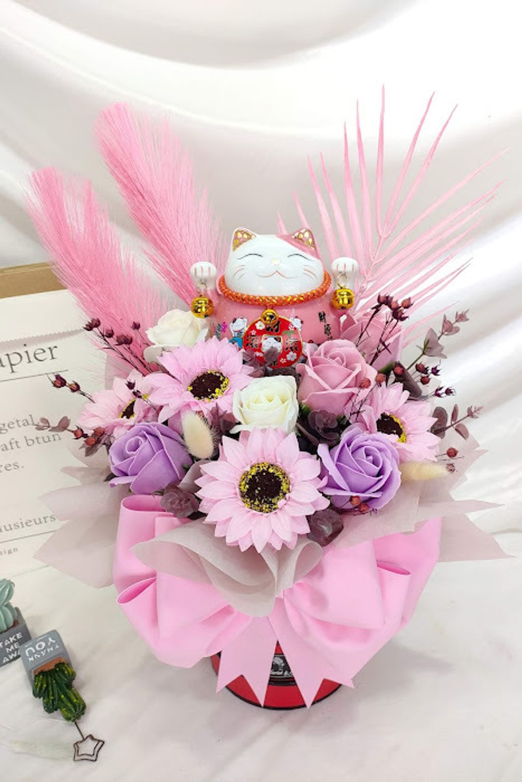 This box arangement features 4.5 inchi Lucky Cat, SOAP FLOWER & DRY FLOWERS.